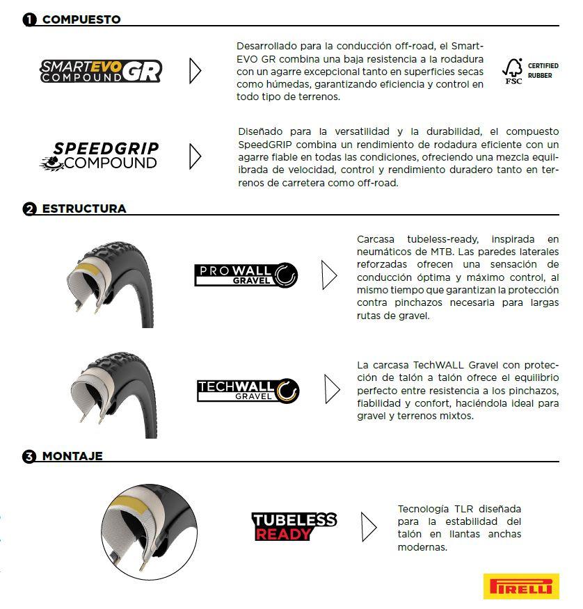 - El compuesto SpeedGRIP es una fórmula de caucho específica para gravel nacida de la experiencia de Pirelli en el Campeonato Mundial de Rally, donde las prestaciones de velocidad y agarre dentro y fuera de la carretera son cruciales. Esta formulación química se basa en la matriz de polímero del compuesto SmartGRIP específico para MTB al tiempo que reduce su resistencia a la rodadura. La aplicación de gravel requiere una buena velocidad y capacidades dentro y fuera de la carretera, por esta razón, nuestros ingenieros ajustaron las características del compuesto para lograr una mejor eficiencia energética con un pequeño coproetiendo poco el agarre, el resultado es un compuesto predecible con un desempeño sólido dentro y fuera de la carretera.